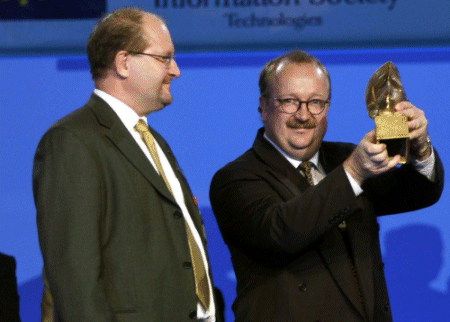 A jubilant Niels Jacobsen, president and CEO of Oticon, accepts the Grand Prize trophy for Adapto at the European Information Society Technology Awards. He is joined on stage by Jes Olsen, Oticon's Director of Business and Product Development. Adapto, the first voice-activated hearing instrument, was chosen over entries from 437 companies and 22 countries.