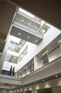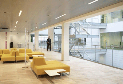 Oticon's new high-tech building offers the latest in fibernet infrastructure providing the most sophisticated set up for the modern electronic work place. Wireless laptops enable people to work anywhere in the house and the 'SmartWorker' concept has been applied to identify the right IT systems in order to improve transparency and minimise trivial non-value-creating activities. Towards the same goal support functions like IT and administration share the same space as the development teams.