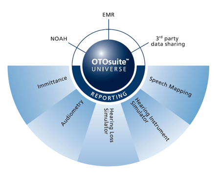 OTOsuite links individual diagnostic and fitting tools together and provides users with a convenient single point of entry to Immittance, Audiometry, Speech Mapping and Hearing Loss/Hearing Instrument Simulators. The OTOsuite universe is characterized by a seamless dataflow and direct integration with NOAH and external systems. It completely eliminates the need to switch back and forth between individual applications, allowing users to move freely from one work process to another. The practice workflow is enhanced and the time savings derived from it significant - even for people working through NOAH.