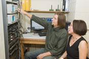 U-M researcher Susan Shore and U-M graduate student Seth Koehler discuss electrophysiological data being collected during an experiment.