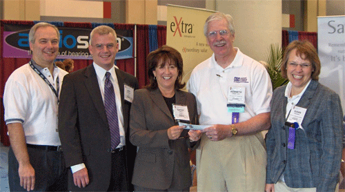 Pictured at the check presentation are (from left to right) Richard Burba, AFA Director, Jeff Dickerson, Phonak Director of Sales, Cathy Jones, Phonak President, Ken Lowder, AFA Chair, and Susan Paarlberg, AFA Executive Director.