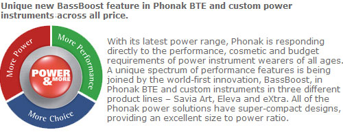 Stäfa, Switzerland (October, 2006) — With its latest power range, Phonak is responding directly to the performance, cosmetic and budget requirements of power instrument wearers of all ages. A unique spectrum of performance features is being joined by the world-first innovation, BassBoost, in Phonak BTE and custom instruments in three different product lines - Savia Art, Eleva and eXtra. All of the Phonak power solutions have super-compact designs, providing an excellent size to power ratio.