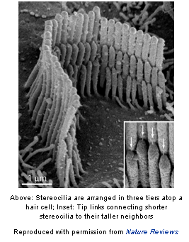 Researchers have long known that hair cells, small sensory cells in the inner ear, convert sound energy into electrical signals that travel to the brain, a process called mechanotransduction. However, the closer one zooms in on the structures involved, the murkier our understanding becomes. When fluid in the inner ear is set into motion by vibrations emanating from the bones of the middle ear, the rippling effect causes bristly structures atop the hair cells to bump up against an overlying membrane and to deflect. Like seats in a three-row stadium, the bristles, called stereocilia, are arranged in tiers, with each lower seat connected to a higher seat by minute, threadlike bridges, or links. As the stereocilia are deflected, pore-like channels on the surface of the stereocilia open up, allowing potassium to rush in, and generating an electrical signal. Because the "tip link", the link that connects the tip of the shorter stereocilium to the side of the adjacent, taller stereocilium, must be present for the channel to function, scientists believe that this structure may be responsible for opening and closing the channel gate. Researchers suggest that if they can learn the makeup of the tip link, they'll be that much closer to understanding how the gate mechanism operates.