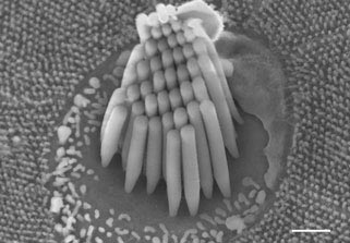 Scanning electron micrograph of the surface of the frog inner ear sensory epithelium showing the staircase-shaped stereocilia towering above other surface structures. Bar equals 1 µm. Photo courtesy of C. Graydon and L. Andrade, NIDCD.