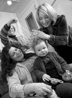 Professor April Benasich (upper right) gently covers a baby's head with sensors that reveal how babies process rapidly occurring sounds, a key factor in language development.