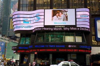 Siemens Hearing Instruments, Inc. celebrates May is Better Hearing and Speech Month in Times Square from May 11 through 28 in many cameo appearances. Siemens will air a 30-second hearing loss awareness video every hour on the ABC Times Square Jumbotron. In addition, 18 Siemens representatives will be in Times Square and various locations throughout Manhattan including Wall Street, Central Park South, and Grand Central Station to distribute educational materials about hearing loss. Siemens representatives will be wearing latest models of hearing instruments, showing the public advancements in technology and size to fit every lifestyle.