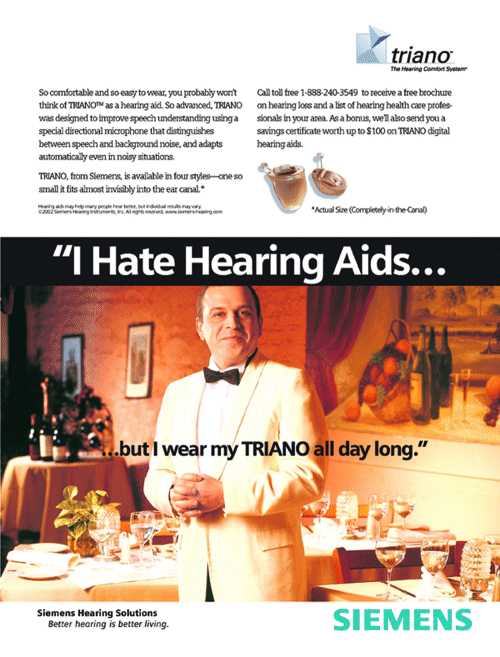 Siemens chose the ad, developed by Integrated Marketing Services of Princeton, New Jersey, ''I Hate Hearing Aids, but I wear my TRIANO all day long'', after consumer testing by American Opinion Research demonstrated its effectiveness to attract both consumers who wear hearing instruments and those contemplating purchasing one.