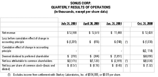 Mark Richards, Chief Financial Officer, stated, "Implementation of SAB 101 adversely affected our bottom line, and masked many important developments. Sonus continues to place an emphasis on outstanding receivables, having improved cash collections 45% during the most recent six months as compared to the immediately preceding six months. Selling, general and administrative expenses did increase during fiscal 2001 as a result of costs related to building the Company's infrastructure, increased advertising for the Sonus Network, increased professional consulting and accounting fees, and costs for electronic connectivity between the Company's hearing care centers and the corporate headquarters. We are confident that our efforts will have a positive impact on the Company's financial results in fiscal 2002."