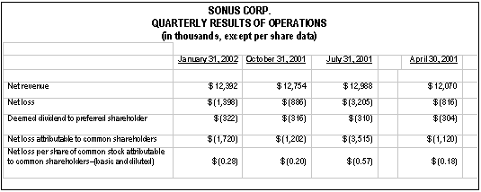 Revenues for the three months ended January 31, 2002 increased 8.2% to $12.4 million from $11.4 million reported for the same period last year. Increased revenues were due primarily to the continued growth of The Sonus Network and higher product sales. The Company's net loss attributable to common shareholders for the fiscal 2002 second quarter was $1.7 million, or $0.28 per fully diluted outstanding share, versus a net loss attributable to common shareholders of $2.0 million, or $0.34 per fully diluted outstanding share, for the second quarter of fiscal 2001.