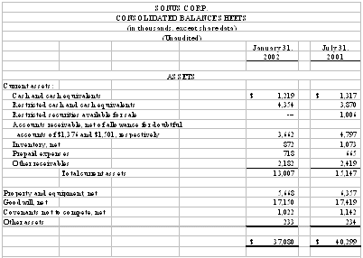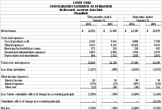 Portland, OR - Sonus Corp. (AMEX: SSN), the largest audiology-based retailer of hearing instruments in North America with 1,346 Company-owned and affiliated hearing centers, today announced financial results for its fiscal second quarter ended January 31, 2002 (see attached tables).
