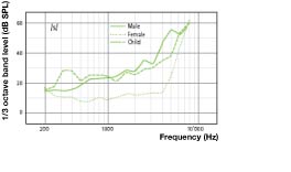 Figure 1. One-third octave band spectra for /s/ spoken by adult male, adult female, and child (reproduced with permission from Stelmachowicz, Pittman, Hoover, Lewis and Moeller,