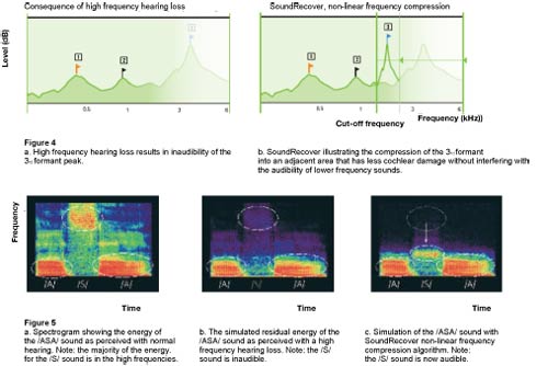 Figure 5c shows a simulation of the /ASA/ sound when amplified with SoundRecover. Note that the high frequency components are compressed to an audible range and that global relations between different frequency components are preserved.