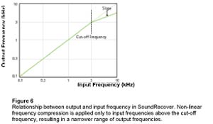 Although the shape of the graph in Figure 6 is similar to that of an amplitude-compression function, it is important to keep in mind that the axes refer to frequencies, rather than levels. The shape of the non-linear frequency-compression function, and therefore the effect on the listener's perception, can be controlled by adjusting two parameters: the cut-off frequency and the compression ratio.