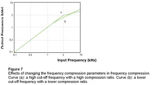 The effect of changing these parameters is illustrated with two examples in Figure 7. Curve (a) shows a high cut-off frequency (3 kHz) and a relatively high compression ratio. This results in processing that affects only the highest input frequencies, although the degree of frequency compression across that frequency range is large. Settings such as these might be suitable for a person having only moderate hearing impairment at high frequencies and less impairment at lower frequencies. Curve (b) in Figure 7 shows a lower cut-off frequency (1.5 kHz) and a lower compression ratio. This results in a lesser degree of frequency compression being applied over a wider range of frequencies. Such settings would be more appropriate for a person with relatively severe hearing impairment across a wide range of frequencies.