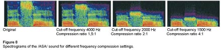 You can clearly see in the speech spectrograms above (Figure 8) that regardless of the amount of compression applied, the frequency compressed output signals do not overlap the low frequency range and the global relations between different components remain intact.