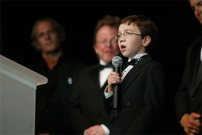 10-year old Matthew Holmstrom of St. Paul, Minn., received hearing aids from the Starkey Hearing Foundation two years ago. He served as the Gala's "poster child" last year. He performed Amazing Grace to a crowd of 1,500 at Saturday's event. Looking on are renowned composer Paul Williams and recording artist Michael Bolton.