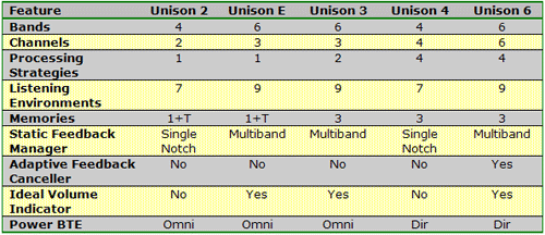 The Unison™ line of hearing instruments was conceived to offer fitters maximum flexibility, and wearers the highest possible value for their money. For example, Unison 6 offers six independent channels, four processing strategy choices, three programmable memories, two feedback managers (multiband and adaptive) and Easy t-coil for automatic hassle-free telephone use. All of these features are available with Unison at an affordable price to provide hearing instrument wearers with the best possible value. The economy class is the fastest growing segment in the hearing aid market and Unison has been designed to be the most fully featured product in that class. Table 1 contains a breakdown of all of features available in the entire Unison line.