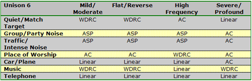 A pair of Unison 6 ITCs is ordered with an Easy t-coil in the left hearing aid. The default listening situations for a mild/moderate hearing loss will automatically be chosen by the Unifit™ software to include: P1 = Quiet/Match Target, P2 = Group/Party Noise and P3 = Telephone. The software will also recommend a WDRC processing strategy for P1, ASP for P2 and Linear for P3. Default processing strategies will differ across listening environments and hearing loss configurations. Unifit defaults for Unison 6 are shown in Table 2.