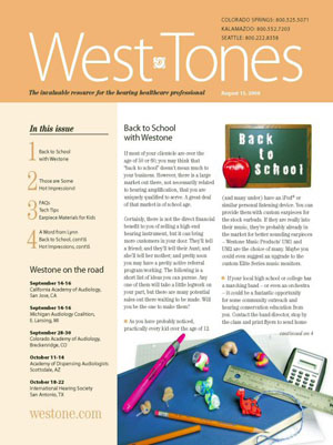 August 15th 2006 - Westone has made their popular West-Tones newsletter available online. West-Tones provides the most recent news and information about the company, including Tech-Tips to bring your earmold and ear impression knowledge to the next level.