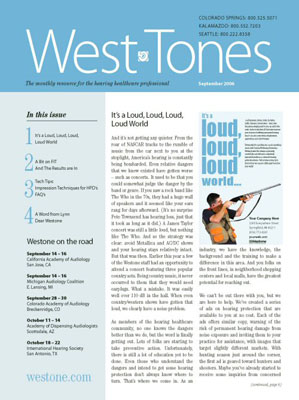 September 15th 2006 - Westone has made their popular West-Tones newsletter available online. West-Tones provides the most recent news and information about the company, including Tech-Tips to bring your earmold and ear impression knowledge to the next level.